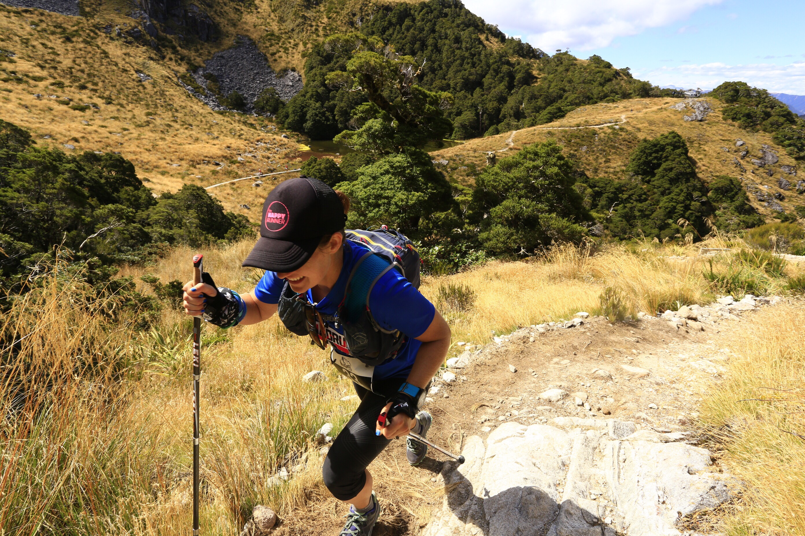As I entered the infamous Bone Yard, I pulled out my hiking polls. The area was super rocky under foot and the bottom of my feet and tender ankles from Shotover were feeling the effects. The extra large NZ bumble bees buzzed around me with one even getting stuck in the front pocket of my running vest where my drink bottle goes, Nz bees like mandarin flavoured Tail Wind, noted.