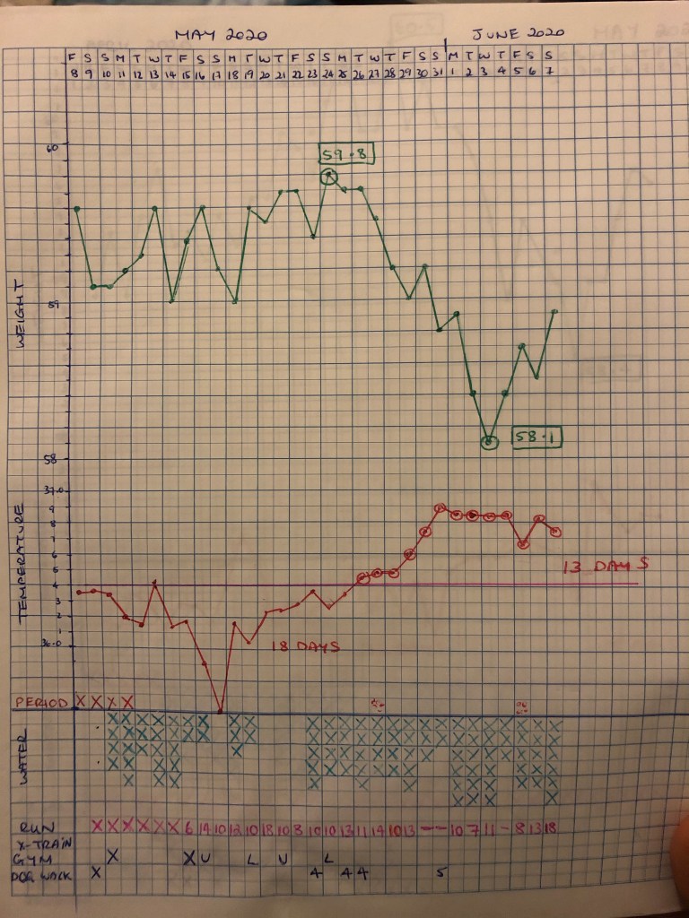 When I got back from New Zealand, I started tracking the data and trying to work out my cycle. I had been following the work of Dr Stacy Sims and a few others online who had stated that you can actually see greater improvements in VO2 max and muscle strength and gains if you schedule your workouts around your cycle.