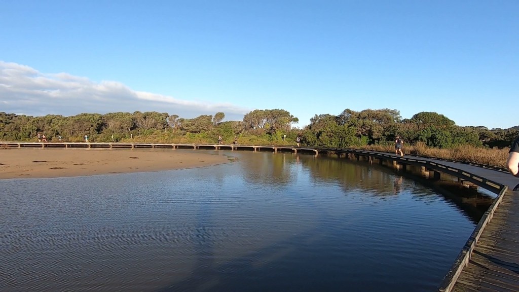 After the 5k-ish shuffle down on the beach, the course follows the Surf Coast walk. You travel down the main boardwalk of Torquay on the concrete footpath (super weird if you wore trail shoes) and then after the caravan park you cross the mouth of the river where it meets the sea and follow the gravel path to the Ironbark basin.