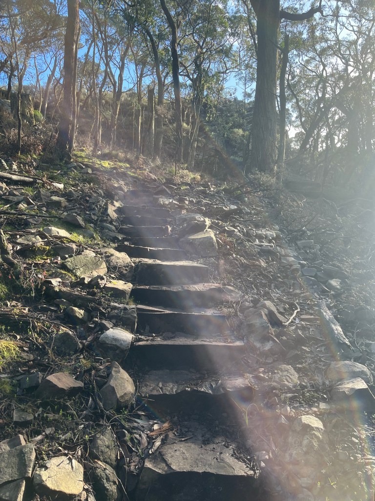 It was up the next climb that the wheels began to fall off for me and it was probably the hardest and “darkest” section of the race. The climb to the top of Mt Abrupt is about 3.5km and according to the internet, 8500 steps. I’m not going to lie, I think at some points, I was travelling at about 1 step every 15 seconds. To say it was slow going is an epic understatement. I think I logged a 25 minute kilometre at one point. I was not enjoying myself. It was lucky I didn’t have phone reception because this is usually the point in the race that I start questioning every single life decision I’ve ever made.