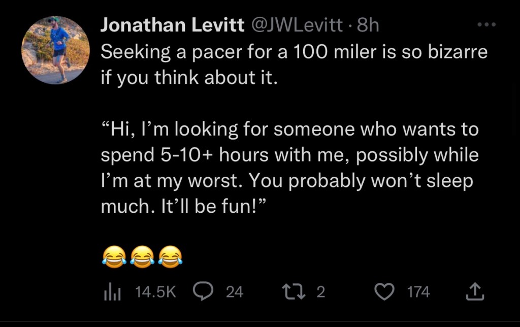I’ve seen multiple people suggest not to have your friends and loved ones crew or pace them because you’ll be at your worst and potentially ruin the relationships you do have.