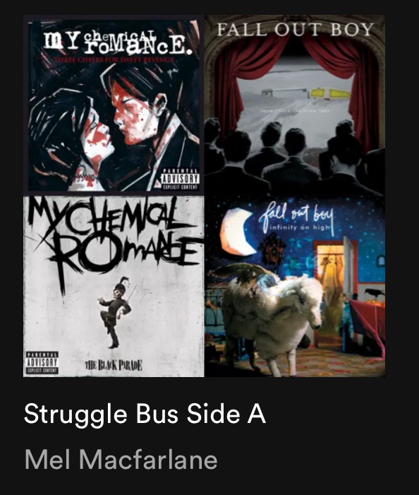 In my mind, the Struggle Bus is a glamorous beast. She is a beautiful, magical bus that only plays bangers, you don’t get sweaty sitting on the seats and it doesn’t make you feel sick going around the corners. Like all good albums, it has an A side and a B side, both equally full of quality tunes, but in stark contrast to each other, 2000’s emo bops on one side, annoyingly cute pop on the other.