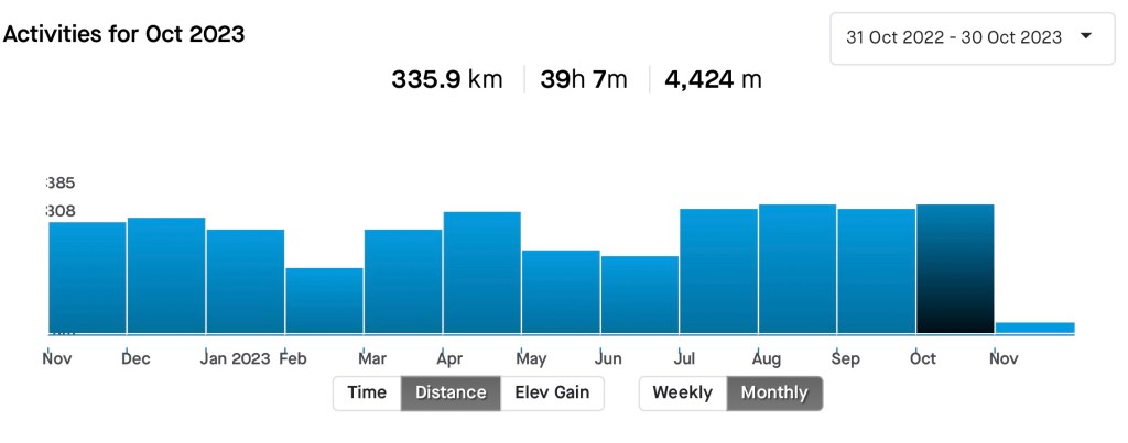 According to my Garmin, October has been my biggest running milage month of the year so far with 330 km run. That’s even with the extra rest day I took yesterday (the 31st) because my quads are still tender to touch from Rollercoaster on the weekend.