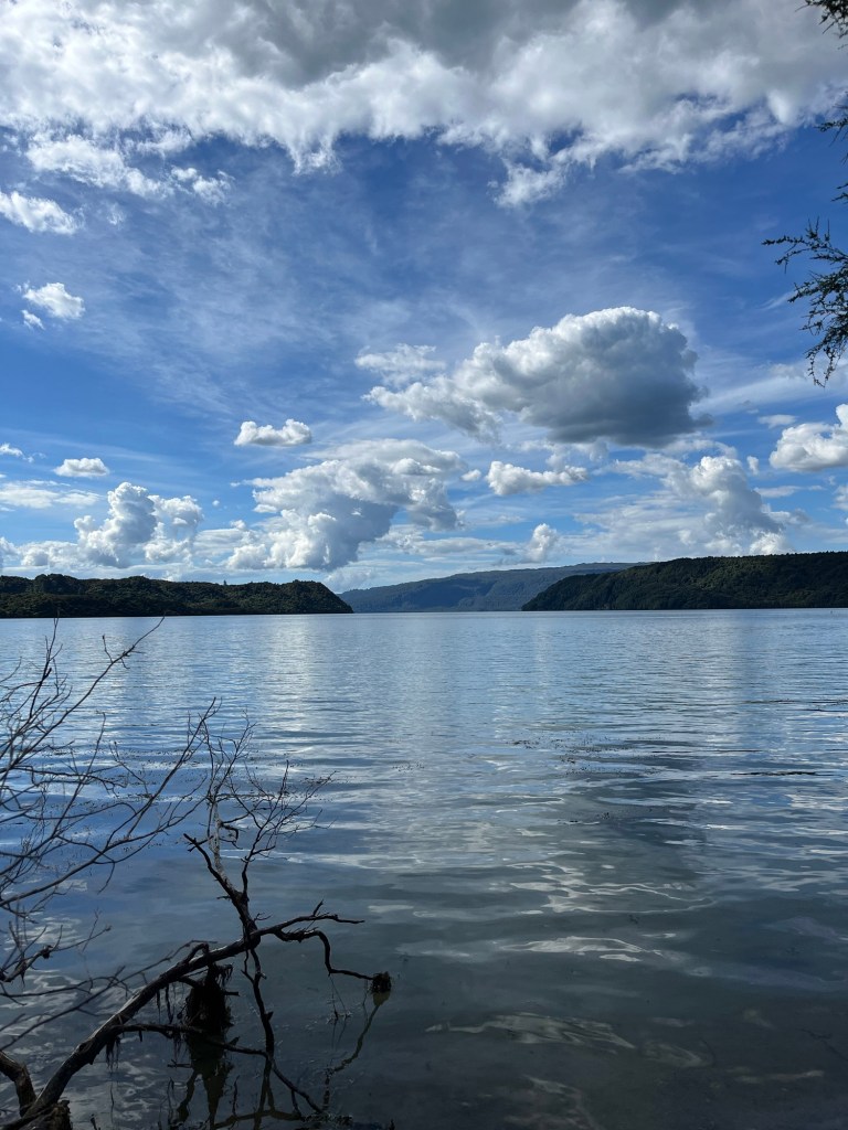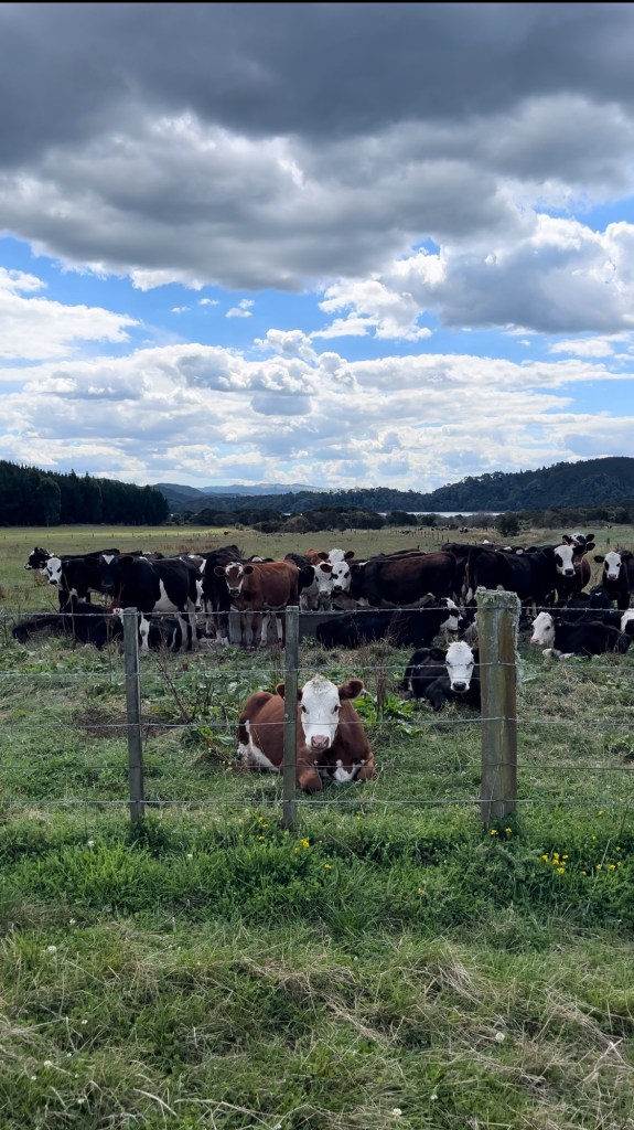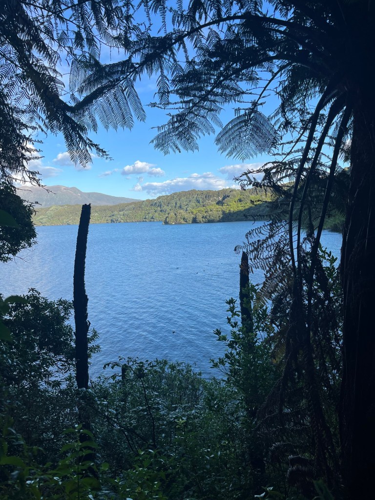After a strange loop through some bloke’s cow paddock, we arrived at the boat crossing of Lake Rotomahana. I was so stoked when the boat wasn’t there because it meant I could lie down in the grass again which seemed to help my back.