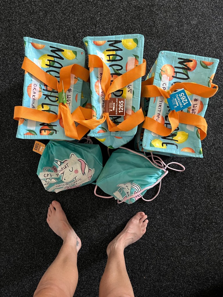 The packing and spreadsheet required for these bags was probably overkill but I calculated the carbs per hour and then planned accordingly with extra stuff that I thought I might like in each one as rewards or surprises. The Bakers Delight scroll in the Tikitapu bag (144km) didn’t look so crash hot after 29 hours in the sun!