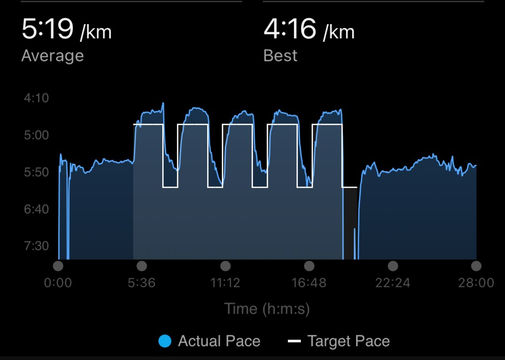 I took the pups for a run as the warm up, switched shoes to the carbon ones (as if that was going to help somehow) and got started on 5 x 2 minutes at 4:50-5 min pace with a one minute recovery shuffle at 6 min pace in between. 4:50 pace shouldn’t feel super hard for me but it bloody did.