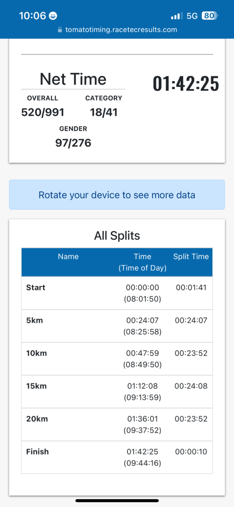 I crossed the line in 1:42:25, an 8 minute and 34 second personal best.