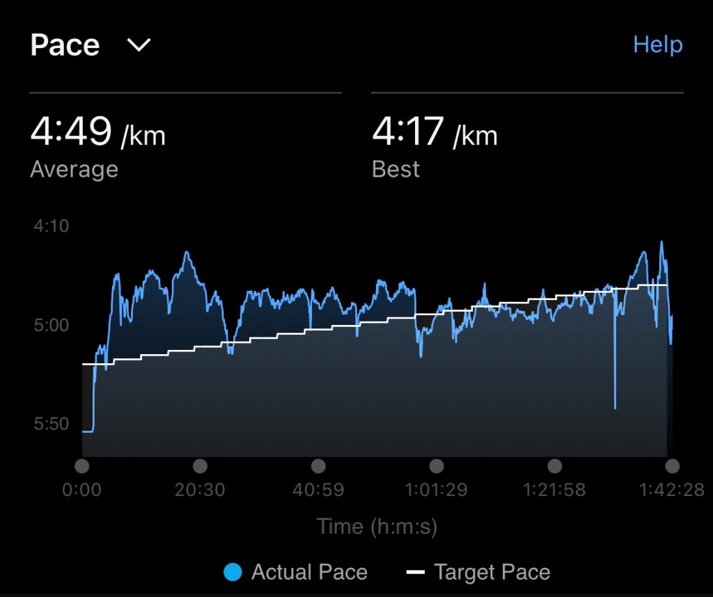 My PB for the half marathon is 1:50:59 from the Run Melbourne half in July 2019 so I knew this watch function was probably going to shit me but I’m not the best at knowing my effort or pace. Once I’m in that pace, I can generally stick to it but I just can’t tell the difference between 5:00 and 4:50 or 5:10, they all feel pretty terrible!