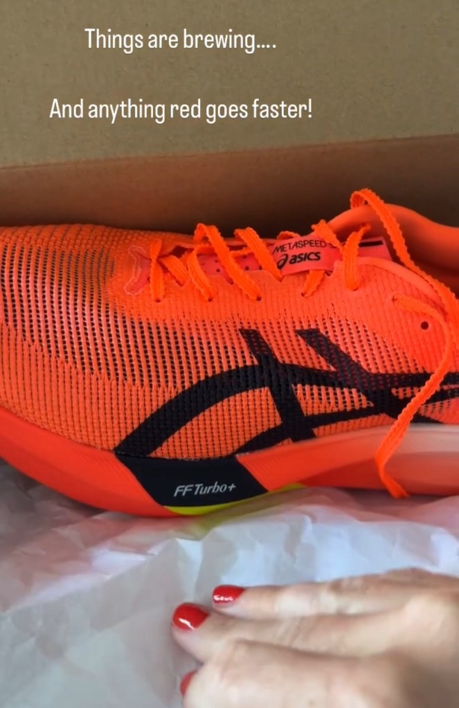 The day before the race, I went to the local running store and bought myself a pair of carbon shoes. I dug out an all black racing kit (nothing about road running is flattering) and painted my nails bright red to match my brand new ASICS Metaspeed Sky Paris super shoes.