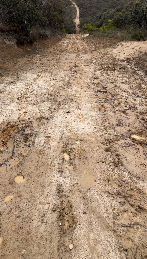 What I failed to factor in was the rain overnight so the road heading to the trail was very very slippery and basic peanut butter mud. Oops