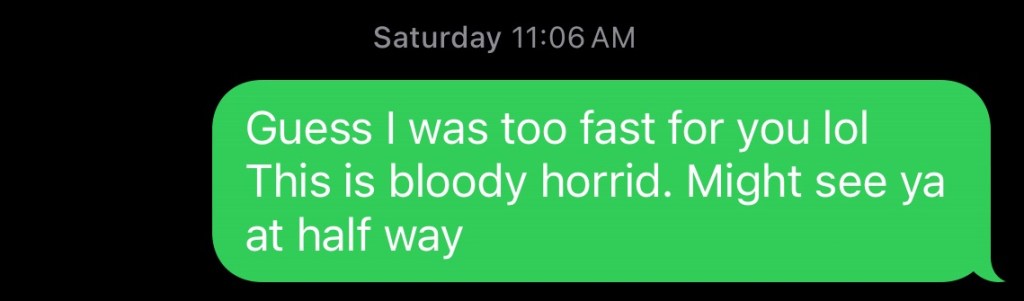 With one AirPod in my ear, I cruised to a bit of Tay and some random stuff Spotify served up. The Proclaimers “I’m Gonna be (500 miles)” was a hit for a couple of k’s. I felt like I had my groove back and maybe it wasn’t all as catastrophic as I had thought.
