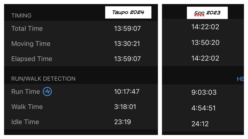73.6% run time compared to 63%. I’ll take it. That’s an hour and 15 minutes more running than my last 100km effort.